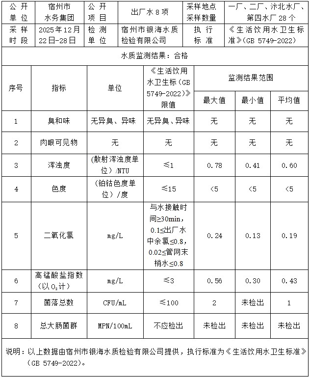 2025年12月22日-28日(第四周)出厂水水质