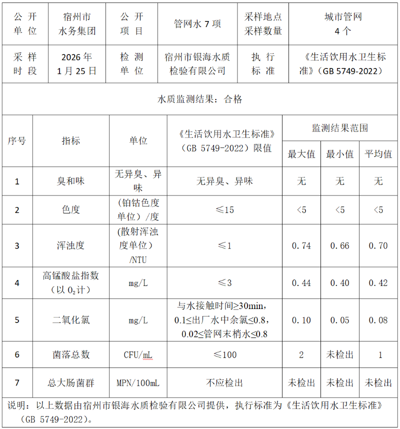 2026年1月25日管网水水质