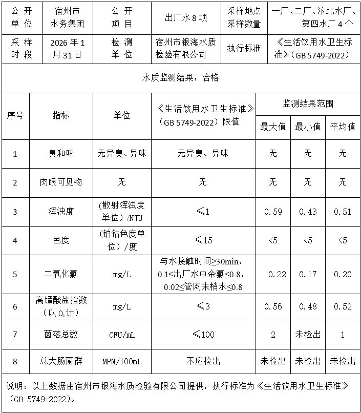 2026年1月31日出厂水水质