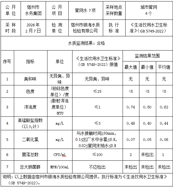2026年2月7日管网水水质