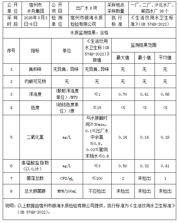 2026年3月2日-8日(第一周)出厂水水质