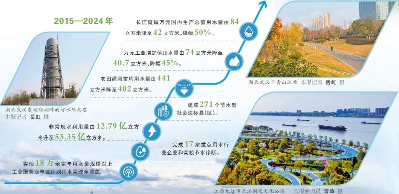 2024年,长江流域万元GDP(地区生产总值)用水量、万元工业增加值用水量,较2015年分别下降50%和45%。